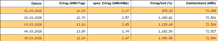 Sollwert: 1.16 kWh/Tag - Durchschnitt: 12.34 kWh/Tag - Maximalwert: 13.50 kWh - Monatsertrag: 61.70 kWh (171.39 %)